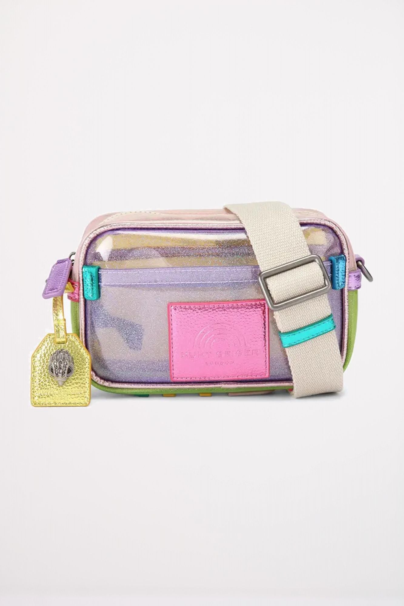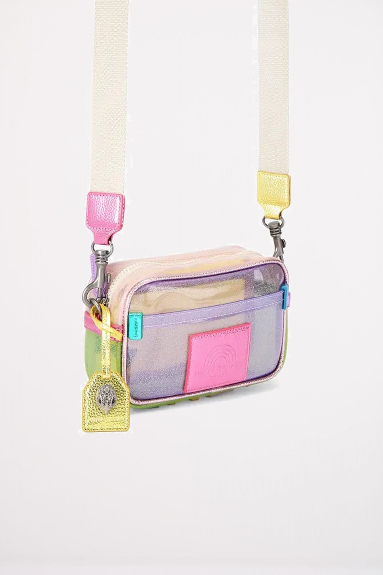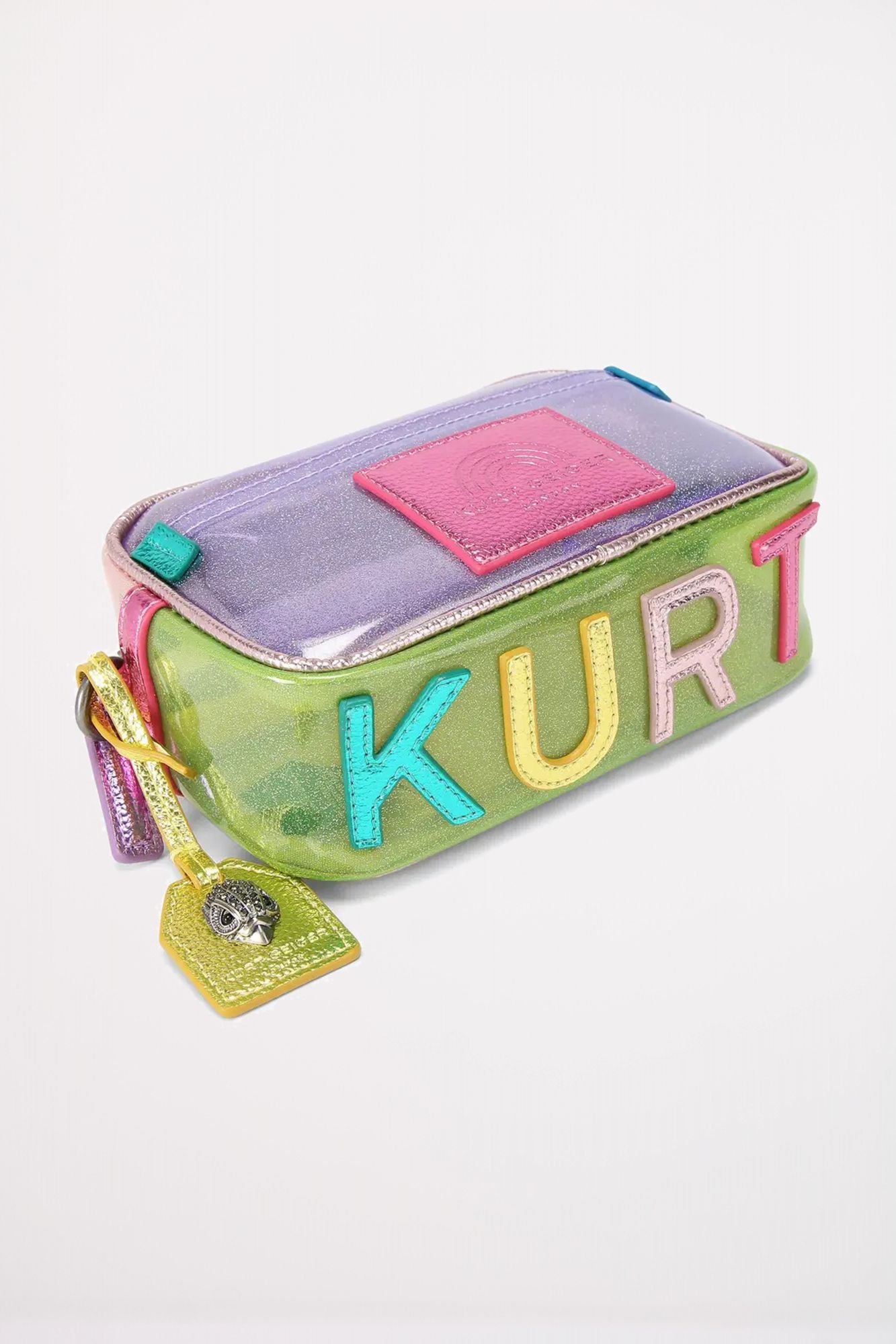 El Small Vinyl Southbank Camera Bag presenta un exterior de vinilo con purpurina arcoíris. Cuenta con detalles metálicos multicolores que coordinan con la marca 'KURT' en la parte inferior de la bolsa.